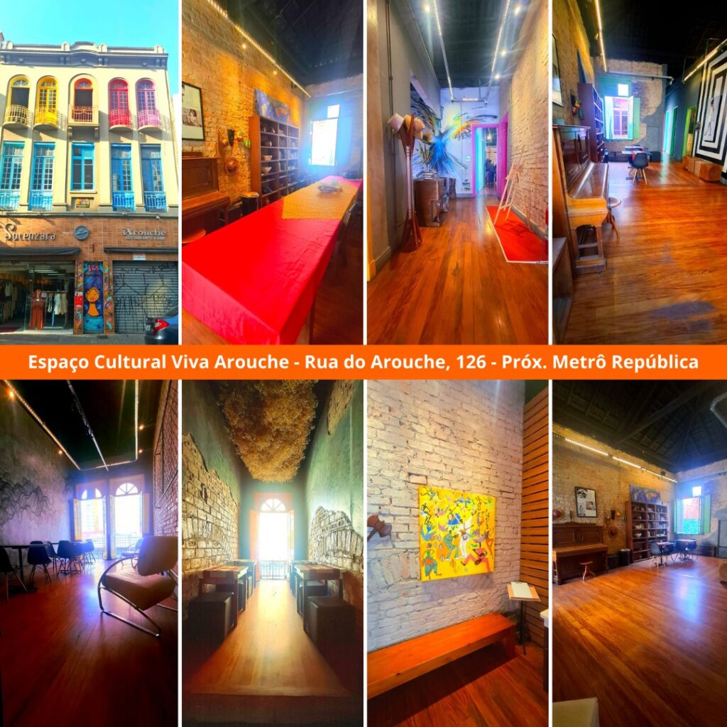 Instalado em um imóvel de dois andares, o Viva Arouche – @vivaarouche – dispõe de infraestrutura completa e versátil, adequada para apresentações, encontros, ensaios, eventos corporativos e atividades educativas.