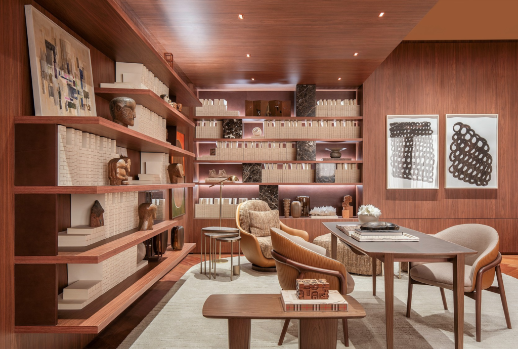 Em sintonia com o tema Maturidade e os 50 anos da marca, arquiteta apresenta espaço de 120 m² que integra living com lareira, jantar e biblioteca em uma atmosfera de conforto, elegância e atemporalidade